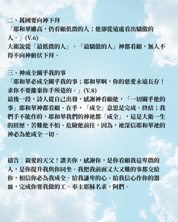 ![]() 經文:詩篇第38篇 題目:「主啊!我錯了!」 | ![]() 經文:詩篇第38篇 題目:「主啊!我錯了!」 | ![]() 詩篇37篇 題目:「務要等候倚靠神」 | ![]() 詩篇37篇 題目:「務要等候倚靠神」 |